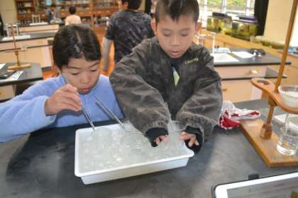 子どもたちは氷水を用意し、加熱して完全に溶かしたミョウバン水溶液を冷却。時間が経つにつれて、試験管の底に小さな結晶が現れ始めると、「やっぱりできた!」「すごい!本当に結晶が戻ってきた!」と歓声が上がりました。