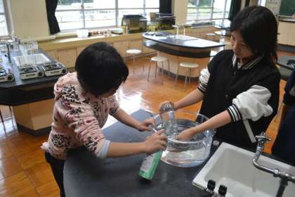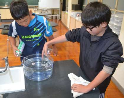 6年生の理科の授業では、二酸化炭素の性質について学ぶ実験を行いました。今回のテーマは、「二酸化炭素は水に溶けるのか?」。子どもたちは、水上置換法でペットボトルにためた二酸化炭素と3分の1ほど残した水を振って、どんな変化が起こるかを観察しました。