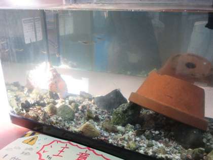昇降口前の水槽に、最近新しいお魚たちが仲間入りしました!現在、「お魚の名前」を大募集しています。