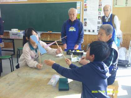 豊田市ものづくりサポーターの講師の先生方8名をお迎えし、3・4年生を対象に「竹とんぼのものづくり教室」が開催されました。教室の冒頭では、講師の先生が2種類の大きな竹とんぼを飛ばして見せてくださり、子どもたちはその飛び方の違いに興味津々。「どうして片方はよく飛んで、もう片方は飛ばないのだろう?」と、みんなで考えるところから学びが始まりました。