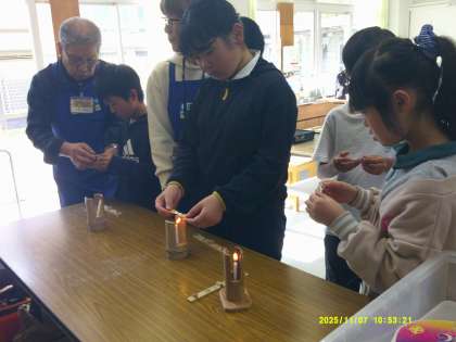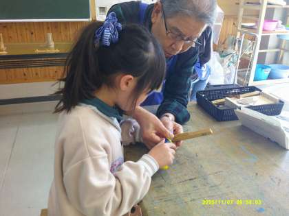 削った竹は紙やすりで磨いて形を整え、羽の中央部分をロウソクの火であぶって柔らかくした後、両手でねじります。右利きと左利きではねじる方向が異なることも学び、飛ばすときの手の使い方に合わせて工夫する姿が見られました。ねじった羽は冷えるまでしばらくそのまま保持し、形が固まるのを待ちます。