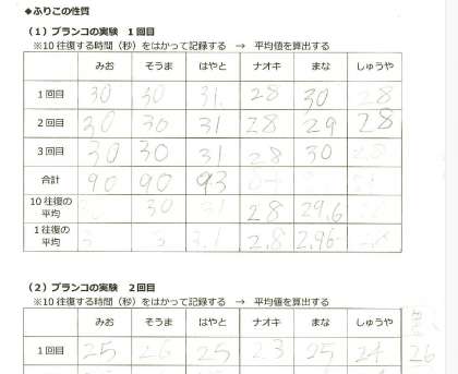 結果を表にまとめ、平均値を出すところまで自分たちで行い、理科と算数のつながりも実感できたようです。