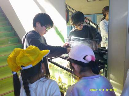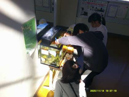 環境保健委員会が管理している水槽の前で、委員の子どもたちがていねいに掃除をしていました。その様子を見て、低学年の子どもたちが次々と集まってきます。水槽の中をのぞき込みながら、「この魚、なんて名前になるのかな?」と興味津々。