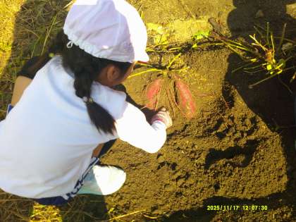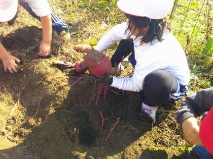 収穫したイモは教室に運び、しばらく置いてから調理をして「おイモパーティー」をする予定です。自分たちで育てたサツマイモを味わう日が楽しみですね。