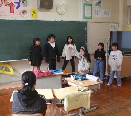 3年生は、地域の高齢者施設「小原安立」との交流会に向けて準備を進めています。この日は、小原のよさを歌詞に込めたオリジナルソングの練習をしていました。歌詞には、四季折々の自然や、地域の人々の温かさなど、小原ならではの魅力がたくさん詰まっています。