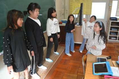 教室では、みんなで声を合わせ、リズムや発音を確認しながら練習する姿が見られました。タブレットを使って音源を確認したり、歌詞カードを見ながら「もっと元気に歌おう!」と声を掛け合うなど、子どもたちのやる気が伝わってきます。