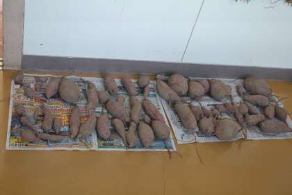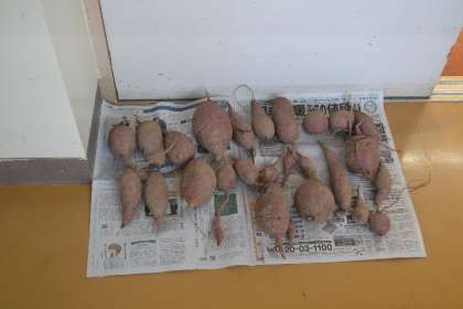 昨日、1・2年生が、育ててきたサツマイモを収穫しました。子どもたちが一生懸命掘り出したサツマイモは、大小さまざまな形で、新聞紙の上に並べて乾燥中です。