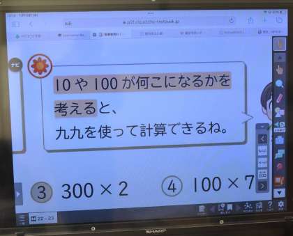 「300×2」「100×7」などの問題を、タブレットと大型テレビ、教科書を使って確認しながら、真剣に考える姿が見られました。