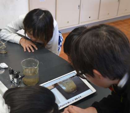 ビーカーの中で砂や泥が沈むスピードや層の変化を観察し、タブレットで記録しながら、地層ができる仕組みを自分たちの目で確かめる姿がとても印象的でした。