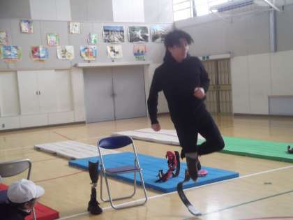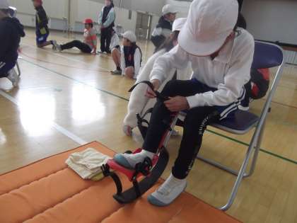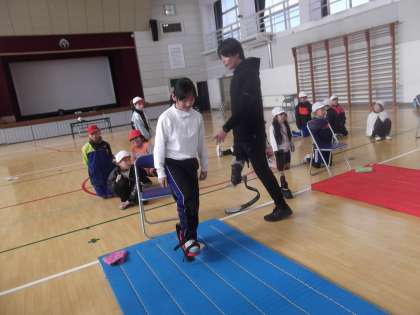 後半は、高学年が実際に義足をはいて体験。「バランスがとれない」「歩きにくい」「いつも通りに歩けない」という感想が聞かれました。
