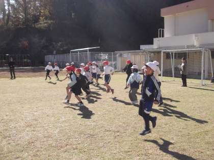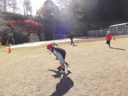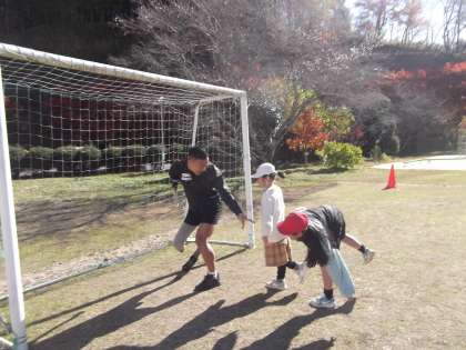 後半の低学年の活動では、片足ケンケンで「だるまさんがころんだ」を楽しみながら、体の不自由さを体験しました。