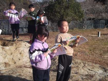 チロが遠くに住んでいるおばあちゃんに呼びかける場面を体験するため、実際に運動場の端から校舎に向かってセリフを言ってみました。