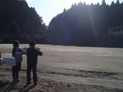 「先生に聞こえるかな?」とドキドキしながら、大きな声で呼びかける子どもたち。遠くにいる担任にしっかり届きました。