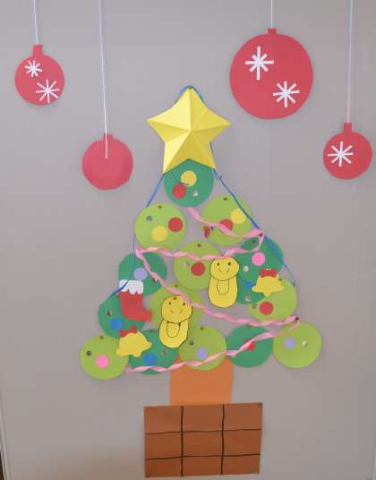 のびっこ学級では、クリスマスツリーの素敵な掲示物が飾られた、あたたかな雰囲気の中で学習が進められています。教室の壁には、子どもたちの手作りによる色とりどりの飾りが並び、季節感あふれる空間が広がっています。