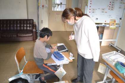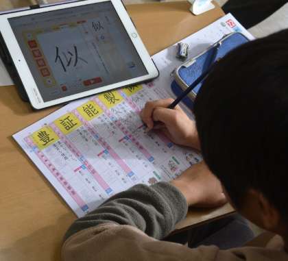 その環境の中で、子どもたちは担任のアドバイスをよく聞きながら、漢字練習やタブレットを使った学習に熱心に取り組んでいます。書き順や意味を確認しながら丁寧に書き進める姿から、学びへの集中と努力が感じられます。