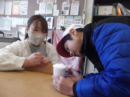 「どうなるかな?」とワクワクしながら、何度もコップをのぞき込む姿がとても微笑ましく、自然の変化に目を向ける力が育っていることを感じました。
