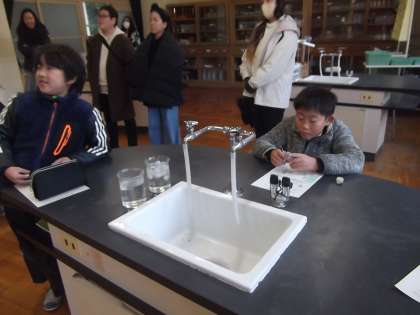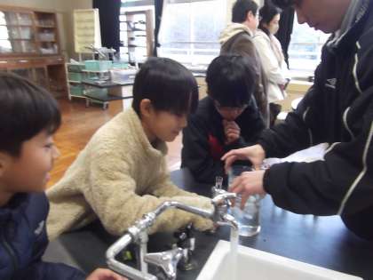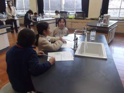4年生は理科の授業で「温度と体積」について学習しました。試験管をお湯と水につけて、石けん膜がどう変化するかを観察する実験に取り組みました。