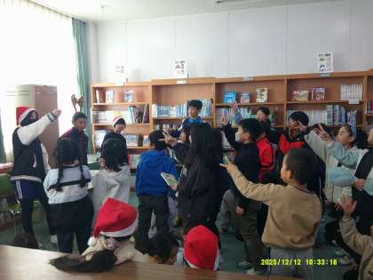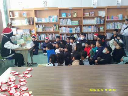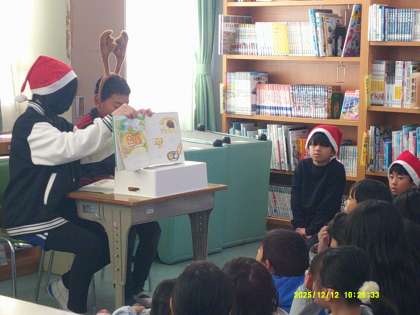読み聞かせの後にはジャンケン大会があり、2回連続で図書委員に勝った子には折り紙サンタのプレゼントが渡されました。子どもたちの笑顔と歓声があふれる、楽しいひとときとなりました。