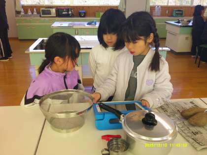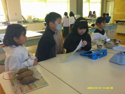 2年生は、1年生に分担や作り方を説明できるように事前に練習を重ねてきました。収穫したサツマイモを班ごとに必要な分量に計量して選び、必要な道具や食器をそろえるなど、準備をしっかり整えました。その後、1年生に説明を行い、自信をもって伝える姿が見られました。