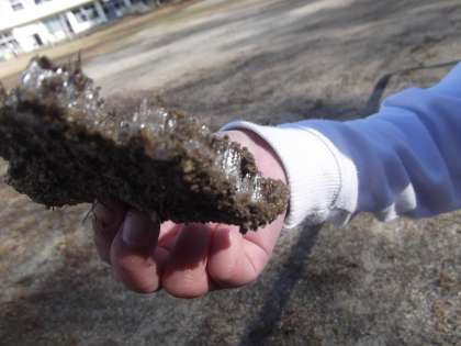朝の冷え込みが一段と強くなり、運動場には白く輝く霜柱ができていました。子どもたちは霜柱を見つけると大喜びで駆け寄り、「土踏むとなんか柔らかい!」「不思議〜」「なんでこうなってるんだろう?」「手で固めると団子つくりやすいよ!」と、次々に疑問や発見を口にしながら、冬ならではの自然を楽しんでいました。