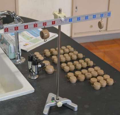 前回の授業で、みんなで協力しておもりの重さを確認(かなりの年代物で、欠けたり壊れたりしているものが散見されたため、電子てんびんで一つ一つ重さを量る作業を行いました)しています。このように、使えるおもりを選別しておいたことで、今回、すぐに、個別に取り組むことができました。