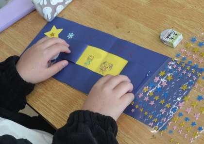 カードづくりでは、色画用紙を折って仕掛けを作ったり、星や雪の結晶のシールを貼ったりしながら、一人一人が思い思いの飾り付けを楽しんでいました。また、「相手が喜んでくれるように」と、人物の絵やメッセージをていねいに描き込む姿も見られました。