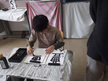 「冬休み中に何十枚も練習してきたよ」とうれしそうに話す子もいて、これまでの努力が作品の表現にしっかり表れていました。授業で学んだ筆の運び方や姿勢などのポイントを思い出しながら、ていねいに仕上げていく姿が印象的でした。