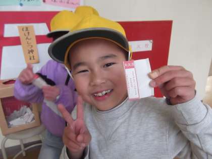 この企画は、子どもたちが楽しく健康を意識できるようにと養護教諭が考えたものです。神社にはおみくじが用意されており、のびのびタイムになると子どもたちが次々と訪れ、運勢を占っていました。「大吉だ!」「努力が身になるって書いてある。書き初めがんばろう!」と、引いたおみくじを見て前向きな気持ちになる姿が印象的でした。中には、特別な運勢「大大吉」を引き当てた子もいて、周囲から歓声が上がっていました。
