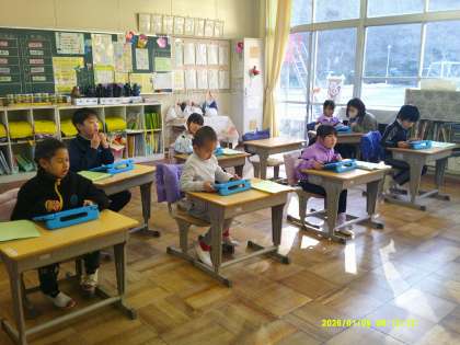 昨日の避難訓練を振り返って、1年生はタブレットを使ってアンケートに取り組みました。自分が訓練中にとった行動を思い出しながら、「よかった点」「もっとこうした方がよい点」などを考え、書き込んでいました。