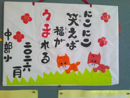 1月の図書館掲示は、午年にちなんだ明るく楽しい作品です。掲示には「にこにこ笑えば 福がうまれる」という言葉が大きく書かれ、周囲には赤い花や折り紙のうし(午年の干支にちなんだモチーフ)が飾られています。