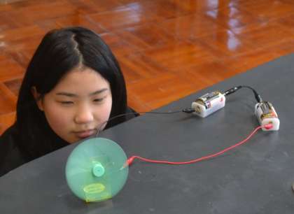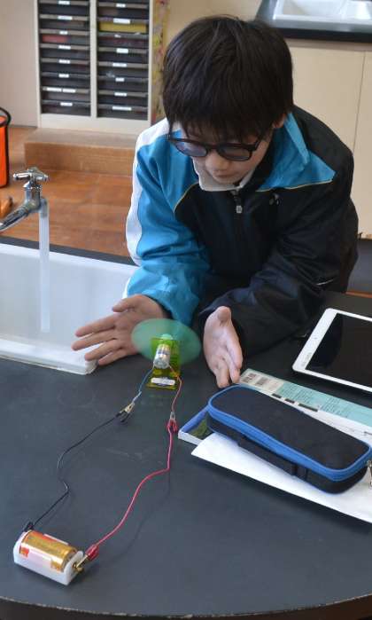 まずは乾電池1個と直列2個での違いを比較。プロペラの回転の速さが変わる様子に、「電池の数でこんなに違うんだよね」と納得の声が上がりました。