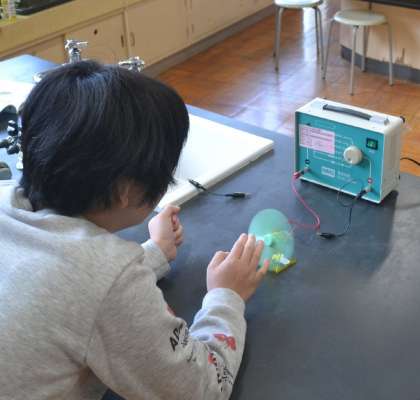 6年生は理科の授業で「電気のしくみ」について、さまざまな電源を使ってモーターのプロペラを回転させる実験に取り組みました。身近な電気の力を、実際に目で見て、手で触れて、深く理解することを目的とした探究活動です。