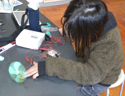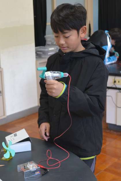 最後は、コンデンサと手回し発電機をつなぎ、電気エネルギーをためてからモーターを回す実験。ためた電気が一気に放出されてプロペラが勢いよく回る様子に、子どもたちは大興奮。「電気をためるってこういうことなんだ!」と、エネルギーの仕組みを実感する貴重な体験となりました。