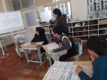 6年生は、登場人物が語る「思い出の場所」を英語で聞き取り、キャラクターと場所を線でつなぐ学習に取り組みました。