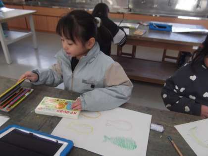 色鉛筆を使い、「何色のステンシルにしようかな」「この色と合わせたらきれいだね」「かっこいい感じにしたいな」など、それぞれがイメージをふくらませながら、楽しそうに色選びをしていました。