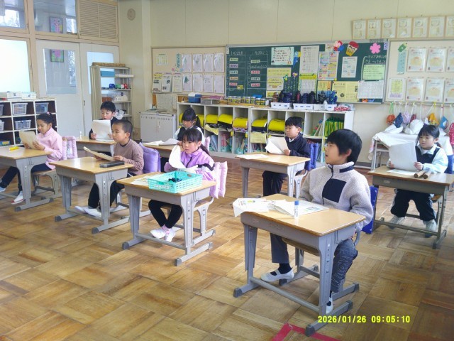 1年生は、国語の学習で「ふくろうのそめものやさん」を題材に、物語をみんなで分担して“語る”活動に取り組んでいます。