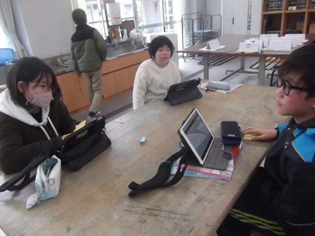 5・6年生の図工の時間。時間をかけて取り組んできたコマ撮りアニメがついに完成し、みんなで作品の発表会を行いました。仲間の作品を鑑賞しながら感想を伝え合う場面では、「ここすご!」「どうやったの?」と驚きや感心の声が次々と上がり、互いの工夫を認め合う姿が見られました。
