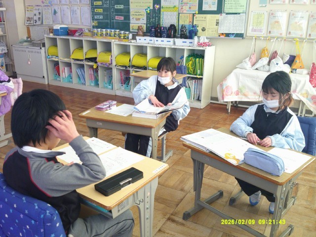 また、2月4日(水)には図書館の出前授業で、図鑑の調べ方について学びました。当日、体調不良で参加できなかった仲間のために、授業を受けた子どもたちが内容を伝える時間を設けました。「目次」や「さく引」を使うと調べやすいこと、「さく引」はあいうえお順になっていることなど、自分が学んだことを一生懸命に説明する姿が見られました。