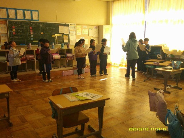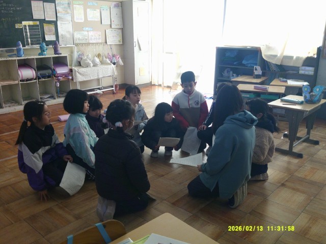 2年生は、学び発表会に向けて「小原のキラリ はっけんたい」の練習に取り組んでいます。まずは全員で丸くなり、読み合わせからスタートしました。教師から、言葉とことばの“間”をしっかり取るところ、反対に間を置かずテンポよく続けて言うところ、ゆっくりていねいに伝える場面や感情を込める場面など、細かなアドバイスを受けながら声の出し方を工夫していました。
