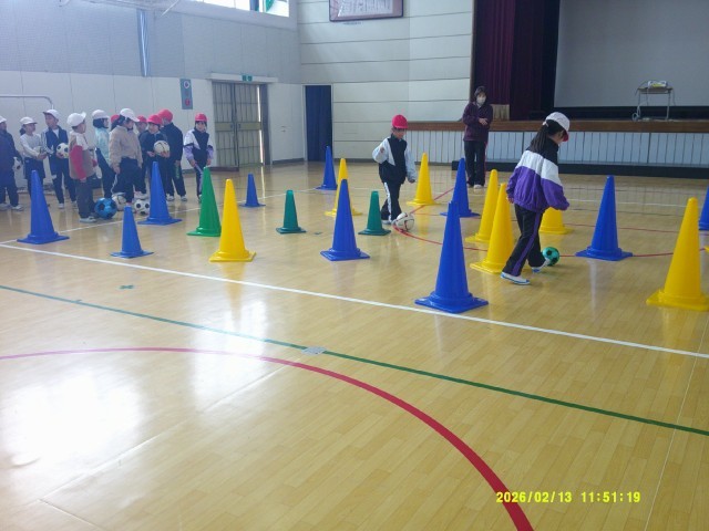 1・2年生の体育では、サッカーの学習に取り組んでいます。はじめに、コートいっぱいに置いたコーンに当たらないようにボールをドリブルする練習を行いました。最初はすぐにコーンへぶつけてしまう子が多い中、少しずつボールの扱いに慣れ、最後までドリブルを続けてゴールまで運べる子も見られるようになりました。
