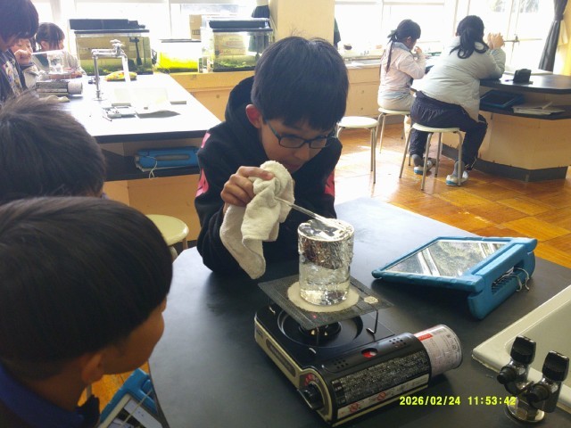 そこで実験です。ビーカーに水を入れてアルミホイルでふたをし、真ん中に鉛筆くらいの穴をあけて加熱します。水が沸騰して湯気が出てきたところで、穴から出る湯気にガラス棒を近づけてみました。すると、ガラス棒の表面に小さな水滴がつくのが確認でき、子どもたちからは「わあ!」「水になった!」と驚きの声が上がりました。湯気は水蒸気が冷えてできた液体であることが確かめられました。
