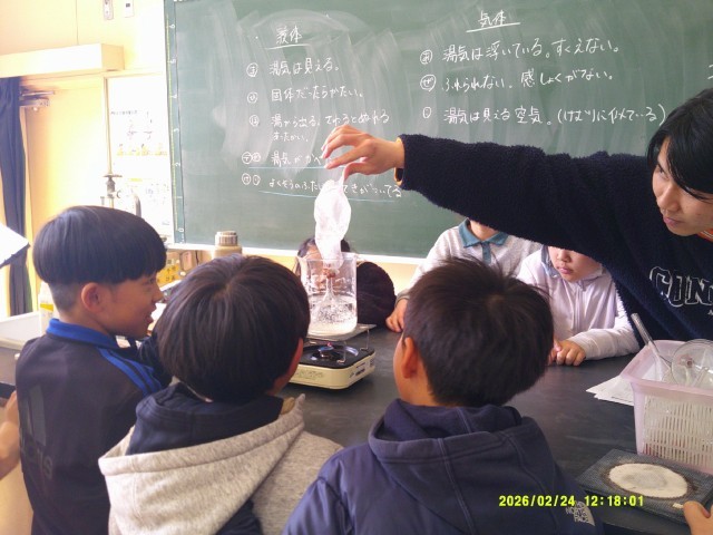 4年生の理科では、「すがたを変える水」をテーマに、湯気や泡の正体について学びました。授業の冒頭では、そもそも湯気は液体なのか気体なのか、みんなで考えてみました。