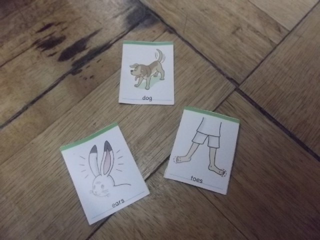 授業が始まる前のちょっとした時間、3年生の教室から楽しそうな声が聞こえてきます。この日の遊びは「英語かるた」。絵とスペルが書かれたカードを囲み、揃ったらその英語を声に出して読むというルールで取り組んでいます。