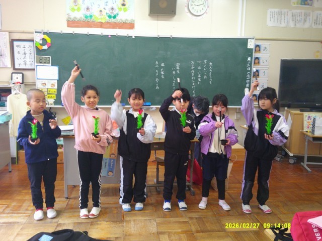 今日は、1年生は校外学習として大草こども園を訪問する日。学び発表会で披露した「ふくろうのそめものやさん」の紙芝居や手話の歌、そして日頃から練習を重ねてきた手品など、こども園の後輩たちに楽しんでもらうための出し物を用意してきました。