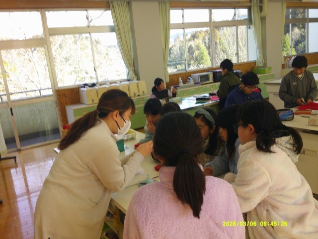 初めて針と糸を扱う3年生にとっては少し難しい工程もありましたが、5年生がそばで声をかけたり、手を添えたりしながら支えてくれました。そのやり取りはとても微笑ましく、学年をこえた温かい交流が随所に見られました。