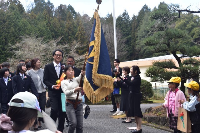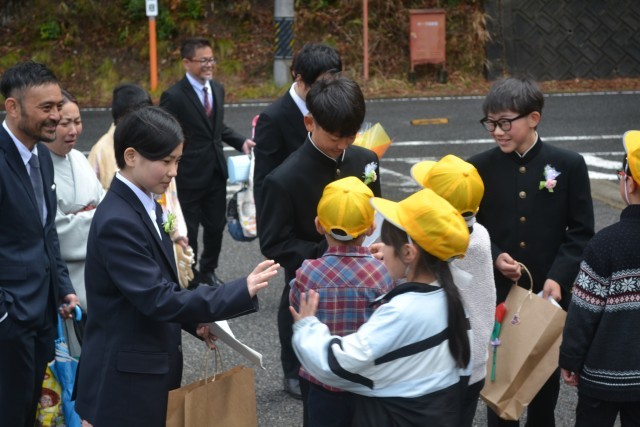 卒業式を終えた後、校門前で「門出送り」を行いました。教職員や在校生に見送られながら、卒業生は一人一人、ゆっくりと学校を後にしました。