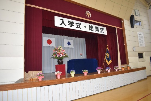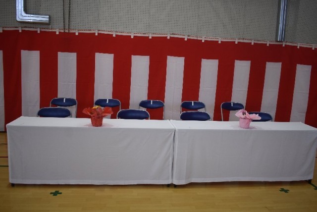 体育館では、紅白幕がまっすぐに張られ、舞台には花が飾られ、国旗や校旗が凛と掲げられています。