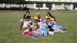 ボールを蹴る練習をした後、ボール蹴りあそびをしました。 赤白に分かれてゲームです...