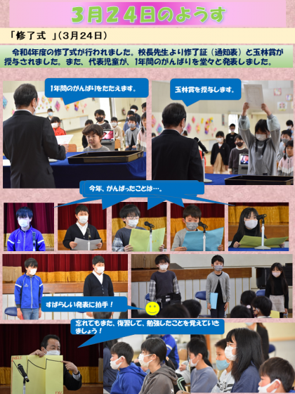 1年間、閲覧いただきましてありがとうございました。3月24日の修了式のようすをお...