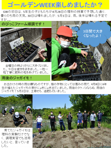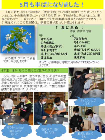 5月も半ば、卯の花の咲く季節となりました。学校のようすをお知らせします。